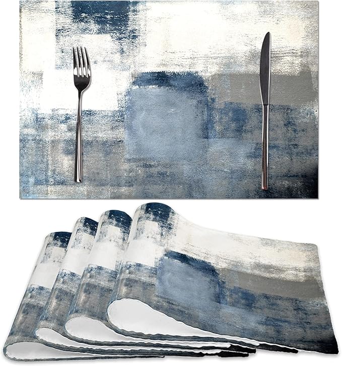 Blue Abstract White and Grey Modern Art Placemats Set of 4, Heat Resistant Non-Slip Artwork Dining Placemats, Washable Place Mats for Home Kitchen (18"X12")