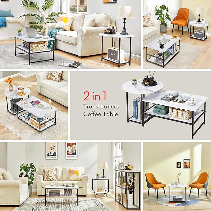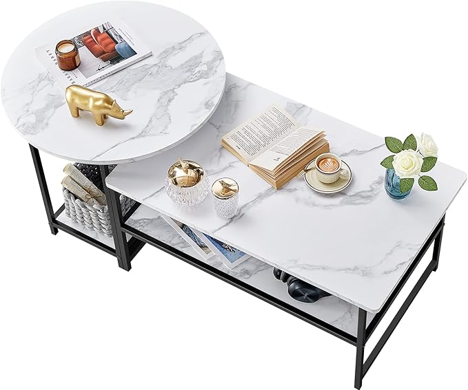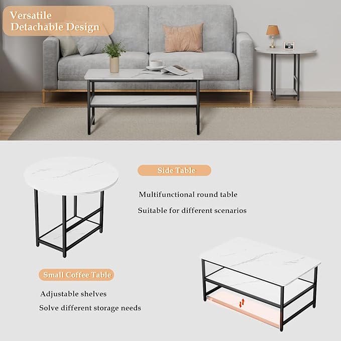 WOHOMO Coffee Table, White Modern Coffee Tables for Living Room, Detachable 2 Small Coffee Tables, Faux White Marble