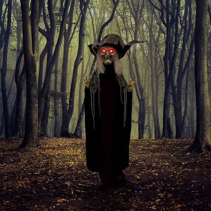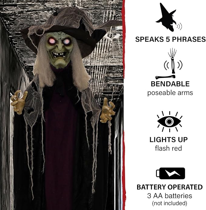 Haunted Hill Farm Life-Size Poseable Scary Talking Witch, Halloween Animatronic with Touch Activated Lights and Sound, Battery Operated Indoor or Covered Outdoor Halloween Decorations, Fright Props