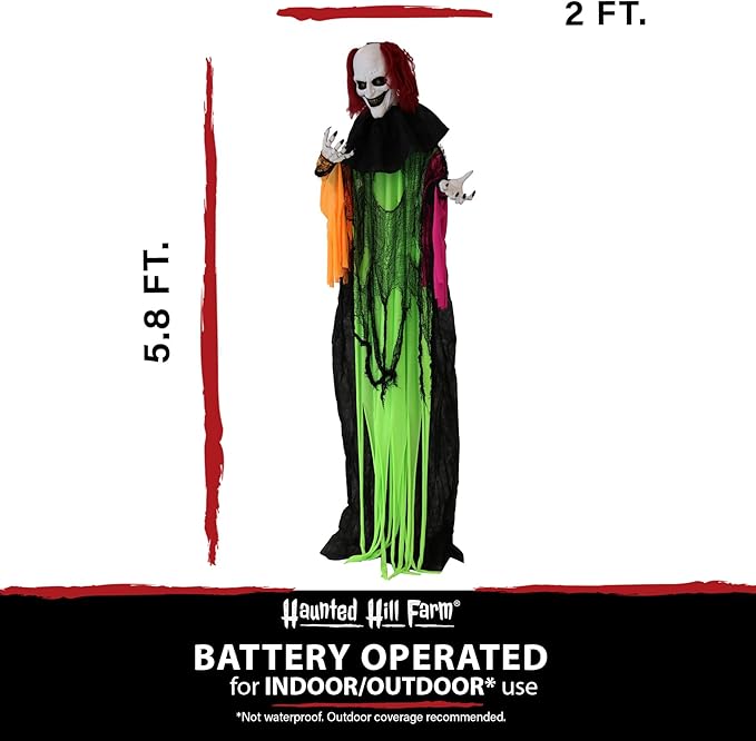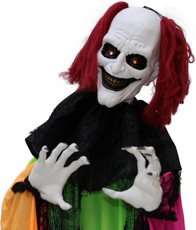 Haunted Hill Farm Life-Size Scary Talking Clown Halloween Animatronic with Motion and Touch Activated Lights and Sounds, Battery Operated Indoor or Covered Outdoor Creepy Halloween Decorations