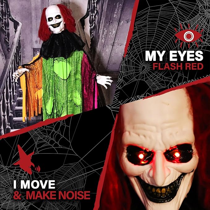 - Life-size Animatronic Clown: This poseable clown is perfect for indoors or a covered outdoor area so you can display your animated halloween decoration in a variety of different places