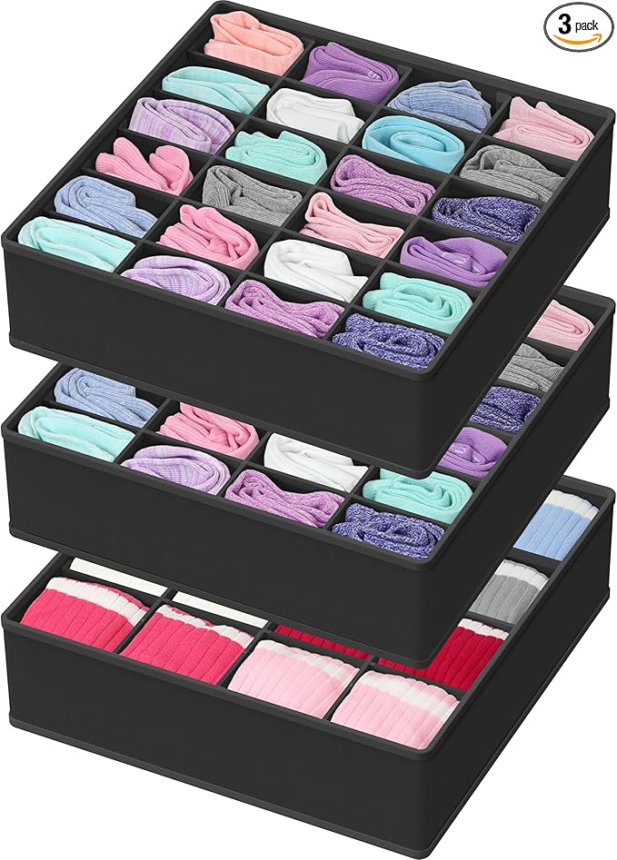 Simple Houseware Sock Drawer Organizer for Dresser/Closet/Bedroom, 3 Pack, Black