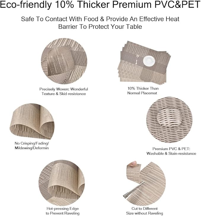 - Premium Material: Made of food-grade PVC material, safe to contact with food directly. 10% thicker than normal placemat and won't crisp, fade or deform. Ultra-durable, UV resistant, fadeless for both indoor and outdoor long-term everyday use