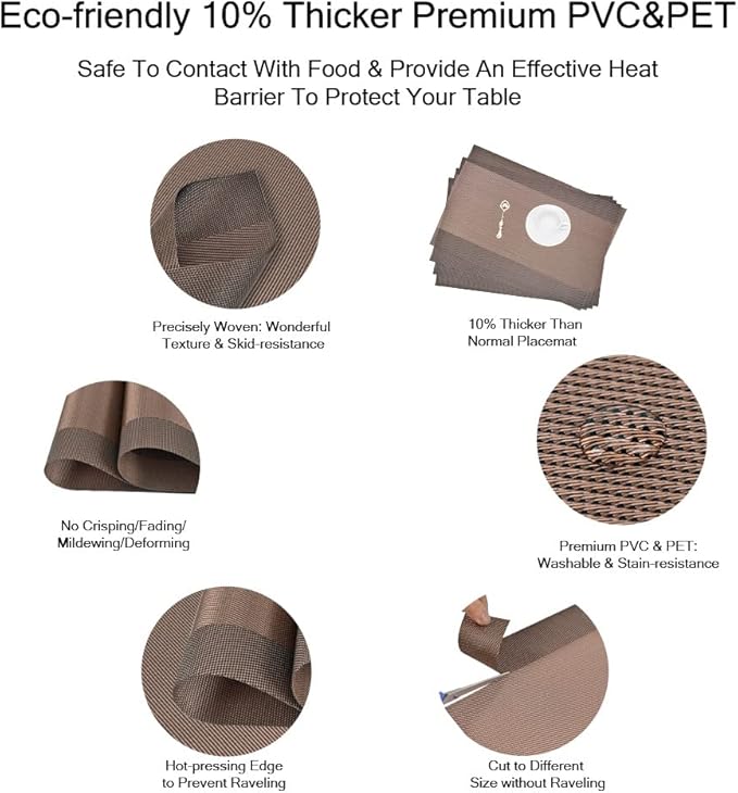 - Premium Material: Made of food-grade PVC material, safe to contact with food directly. 10% thicker than normal placemat and won't crisp, fade or deform. Ultra-durable, UV resistant, fadeless for both indoor and outdoor long-term everyday use