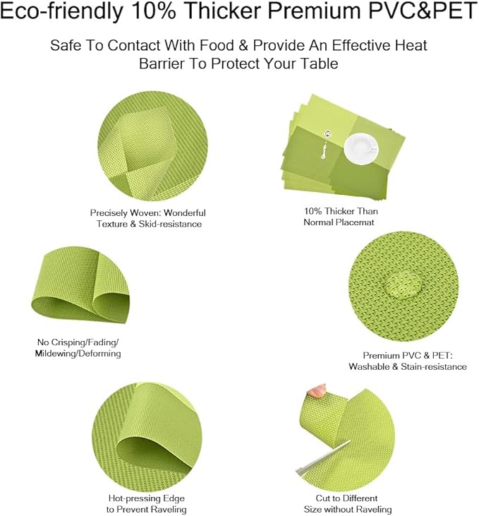 - Premium Material: Made of food-grade PVC material, safe to contact with food directly. 10% thicker than normal placemat and won't crisp, fade or deform. Ultra-durable, UV resistant, fadeless for both indoor and outdoor long-term everyday use