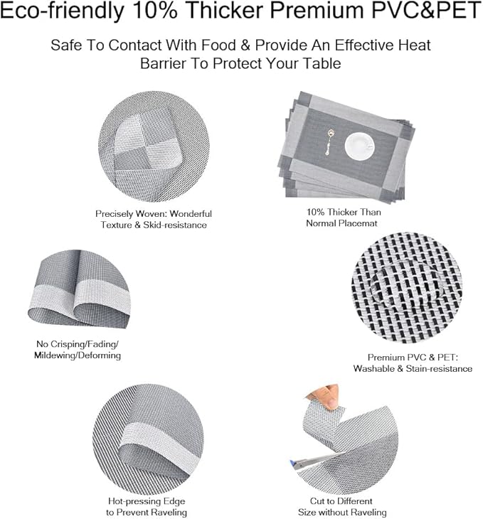 - Premium Material: Made of food-grade PVC material, safe to contact with food directly. 10% thicker than normal placemat and won't crisp, fade or deform. Ultra-durable, UV resistant, fadeless for both indoor and outdoor long-term everyday use