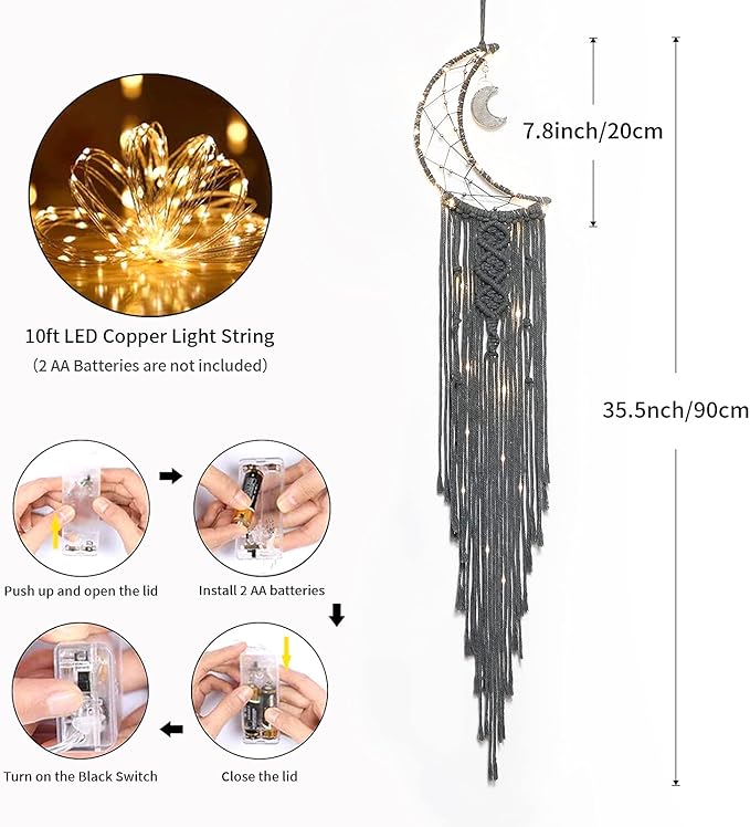 - ☆ Material: Moon Design Ornament + Cotton Cord + Black Bead+ Copper wire string lights(you need to twine the string lights by yourself)