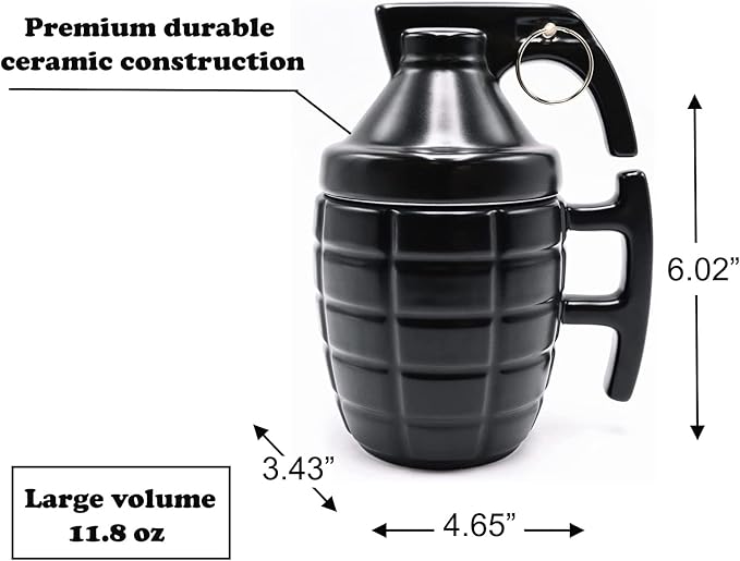 - π¨π‘ππ€π¨π πππ¦πππ‘: This grenade coffee mug with a lid (Black) is designed to resemble a tactical grenade, making it a unique and standout weapon mug for your collection. Perfect for anyone looking for a stylish yet functional grenade mug.