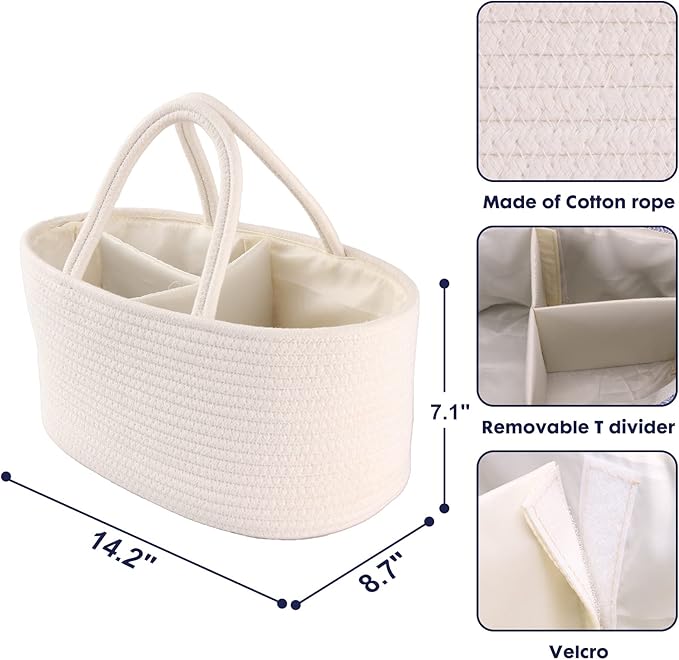 - Stylish diaper change organizer: Our changing caddy is perfect to store small baby items by size 14.2"L*8.7"W*7.1"H. This baby tote designed with long handles and removable dividers. With multi compartment, you can organize baby essentials such as diapers, wipes, lotions, bibs, onesies, baby toys, cloth diapers, changing pads and more, large enough for baby necessities or baby nursery essentials.