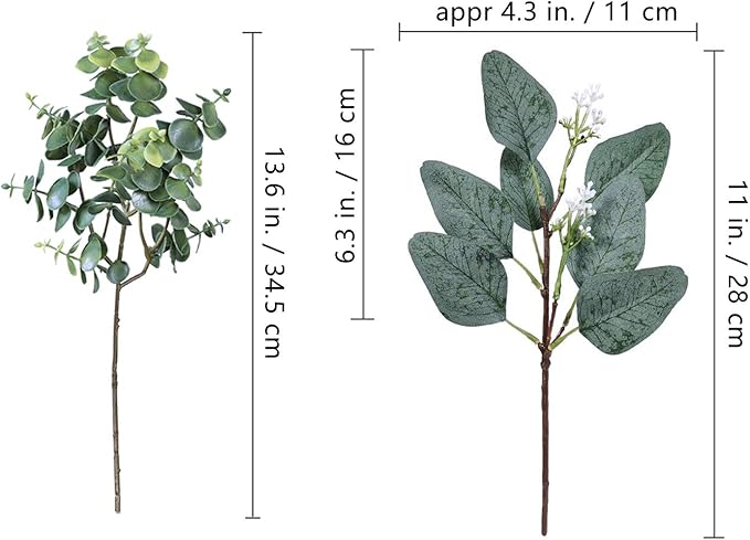 - Size: Each Artificial Baby Eucalyptus Leaf Spray is about 13.6" tall and 6" wide, and leaves are appr. 0.4"-1" in diameter. Each Silk Seeded Eucalyptus Leaves Spray is about 11" tall and 4.3" wide, and leaves are appr. 2.5"-2.8" in length and 1.3"-1.9" in width.
