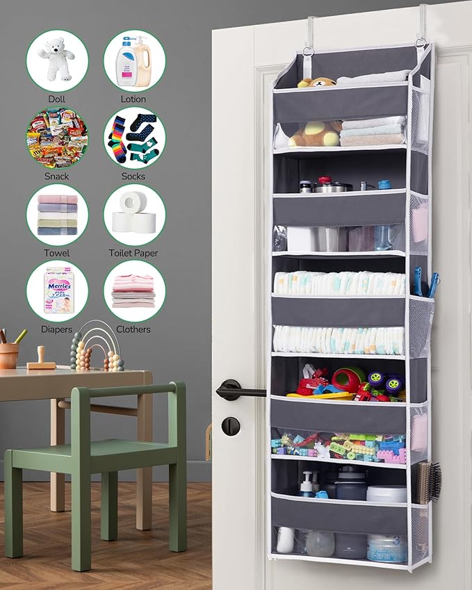 - Versatile - This baby organizers and storage is suitable for children's rooms, storage rooms, offices, laundry rooms, bedrooms, bathrooms, dormitories, etc. toys, diapers, wet wipes, baby towels, socks, etc. It is suitable for child’s room behind the door, or bedroom to store cosmetics, hair dryers, kettles, curling irons. With two provided metal hooks, the foldable organizer can be hung over a door with thickness less than 2.0in.