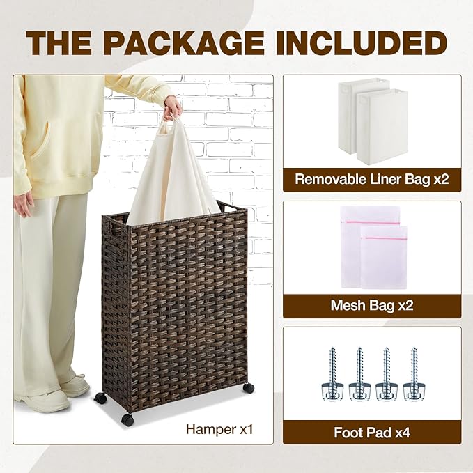 Greenstell Laundry Hamper with Wheels, 17.4 Gallon (66L) Slim Laundry Basket with 2 Removable Liner Bags & 2 Mesh Bags, Narrow Rattan Clothes Hamper for Bedroom, Laundry Room, Bathroom, Brown