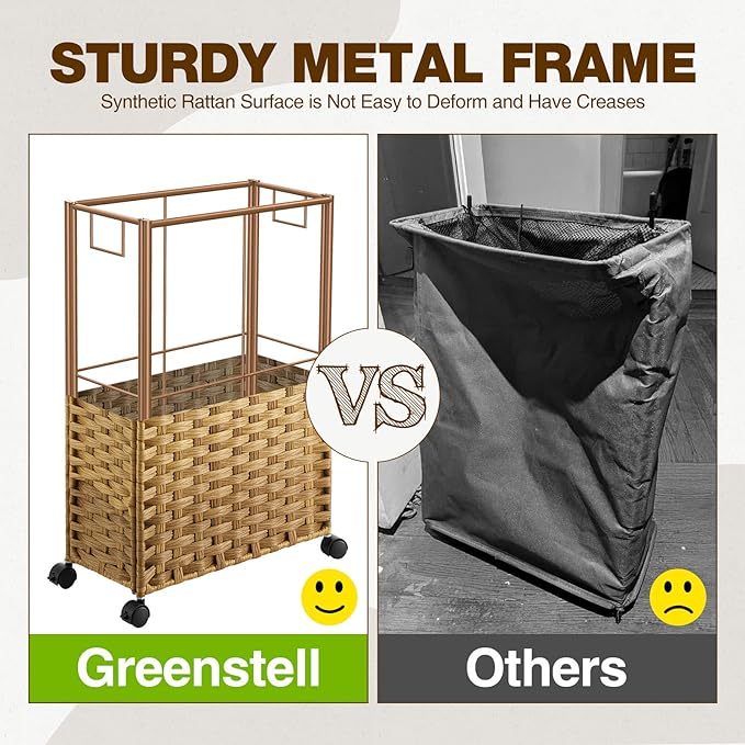 - Handwoven Craftsmanship: Greenstell laundry hampers with wheels are made of durable synthetic rattan materials that are waterproof, lightweight and durable. The laundry basket is made by professional craftsman, and each piece is unique, so there are subtle differences. Bright natural veneers and delicate weaving is suitable for any style of furniture design