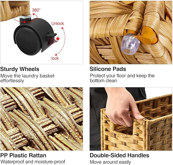 - Handwoven Craftsmanship: Greenstell laundry hampers with wheels are made of durable synthetic rattan materials that are waterproof, lightweight and durable. The laundry basket is made by professional craftsman, and each piece is unique, so there are subtle differences. Bright natural veneers and delicate weaving is suitable for any style of furniture design