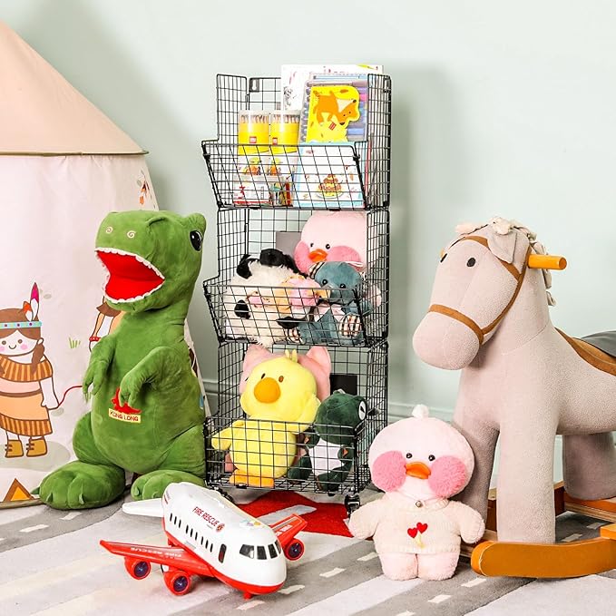 - STURDY & DURABLE CONSTRUCTION - Made of sturdy metal, 3-tiered setup can hold 50+ pounds of weight. Thicken the powder coated, strong rustproof, not rust as quickly as general metal wire basket. Slanted panels and Open basket design to maximize airflow, keep your kids' items dry and prevent moisture.