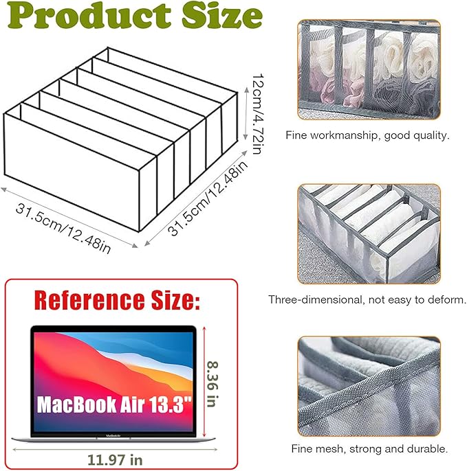 - 【Size of Bra Organizer】The storage box has 4 size designs, which can meet all your storage needs and can solve most of the daily clothes storage problems.(7 Grids T-shirt Grid Size:14.17*6.69*4.72 inch; 7 Grids Thin Jeans Grid Size:14.17*9.84*7.87 inch; 9 Grids Leggings Grid Size:14.17*9.84*7.87 inch; 6 Grids Bra Grids Size:12.59*12.59*4.72 inch ).