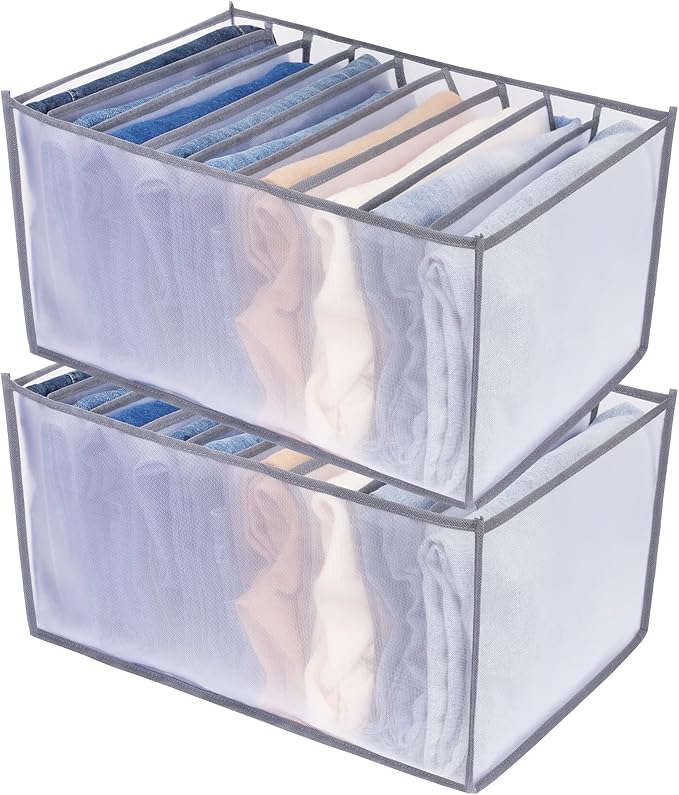 - WIDELY USED: Very suitable for storing pants, jeans, sweaters, sweatshirt, underwear/lingerie, bra, panties, innerwear, socks, scarves, leggings, skirts, T-shirts, or baby clothes other items. There are multiple compartments for sorting and organizing your belongings,suitable for storage in drawers, dressing tables, bed bottoms, wardrobes, etc. The jeans organizer for closet helps you take back control of your closet,keep your living space organized.