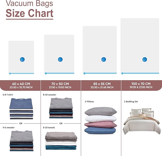 - Increase 80% storage space: our vacuum bags add more room to your clothes storage & wardrobe, lofts & suitcase by 4 times. Our vacuum sealer bags can be used for a variety of items including clothes, comforters, pillows, duvet, beddings, etc.