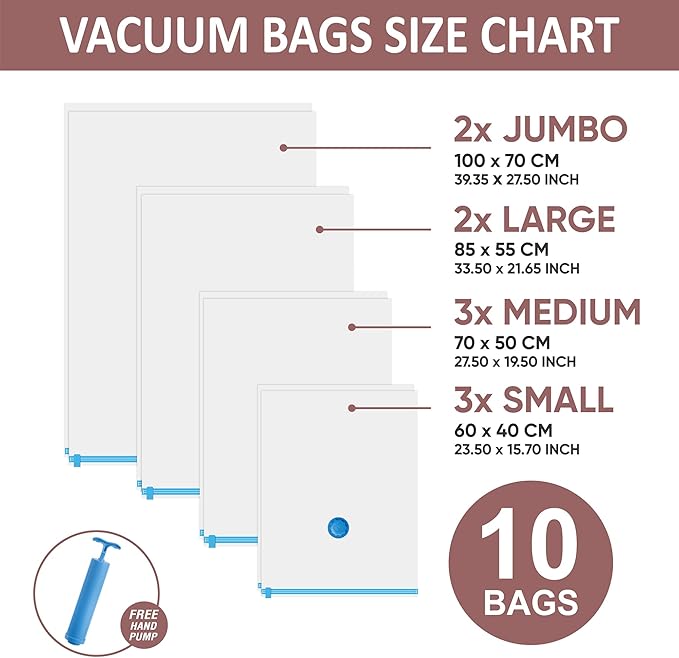 - 10 combo includes: 2 jumbo bags (39.4 x 27.5 in) fitting 1 bedding set; 2 large bags (33.5 x 21.7 in) fitting 2 pillows; 3 medium bags (27.5 x19.5 in) fitting 8-10 clothes/towels; 3 small bags (23.5 x 15.7in) fitting 6-8 T-shirts or 4-6 sweaters.
