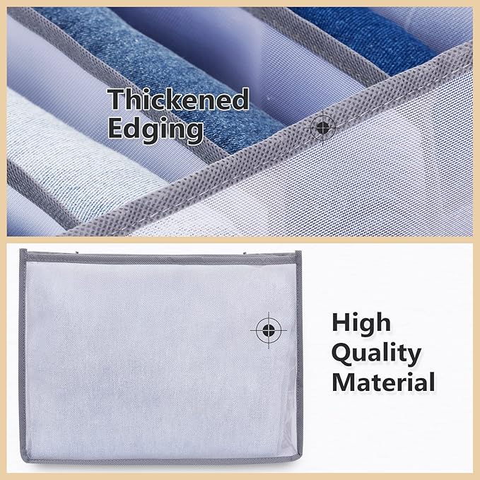 - Widely Used: This organizer clothes is very suitable for storing jeans, leggings, skirts, T-shirts, baby or kids clothes, pet clothes, underwear, socks or other items. You can use it for storage in wardrobes, drawers, dressing tables, bed bottoms, etc. There are 7 or 9 grids for sorting and organizing your belongings and it keeps your living space organized