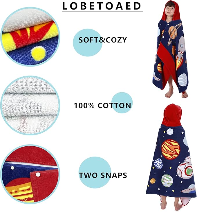 • ?MORE FRIENDLY DESIGN for KIDS?? Our baby bath & hooded towel has two snaps on the side to help you wrap your child up in comfort and playful style.This surf poncho is easy to put on and off, and will not slide down from body.The hood can helps dry your child's hair. We have many cute cartoon styles suitable for boys & girls like Dinosaur, Mermaid, Cat, Unicorn, Shark, Car, Narwhal...