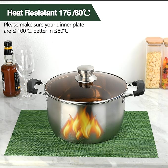 - Heat Resistant: Please make sure your dinner plate are ≤ 100℃, better in ≤80℃. It can prevent the table from slipping and scalding the countertop. These beautiful stylish vinyl place mats to add more fun to your dining table