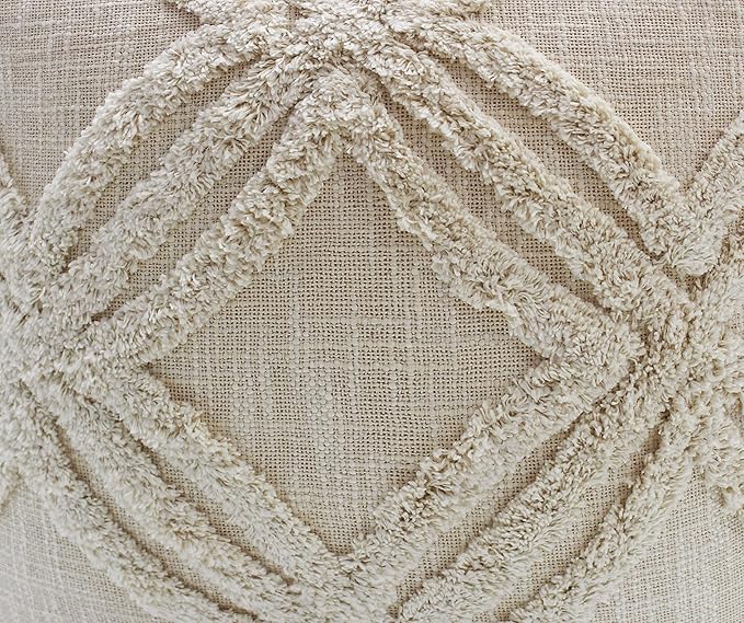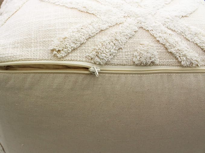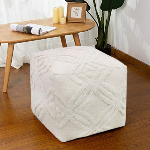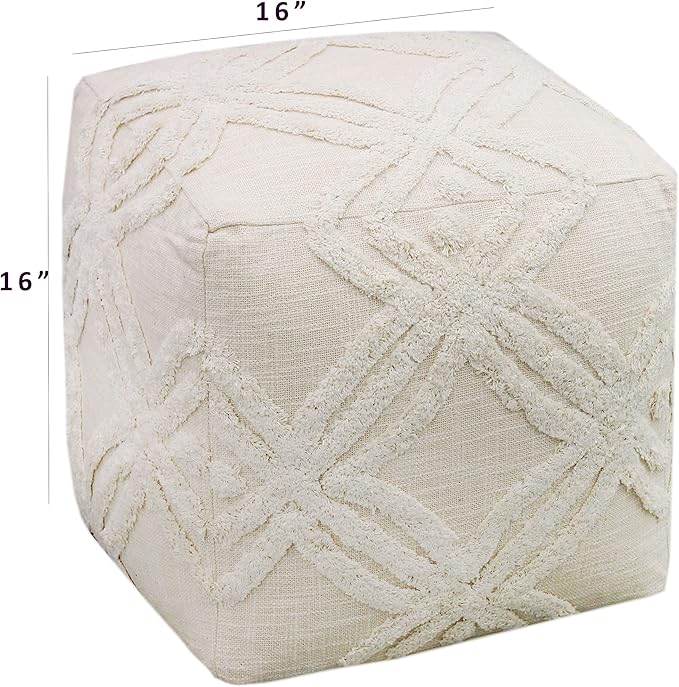 - Includes: One (1) filled Cotton Tufted Square Pouf measuring 16 inches by 16 inches by 16 inches. Filled with dense polystyrene to retain structure and shape. Color-Ivory