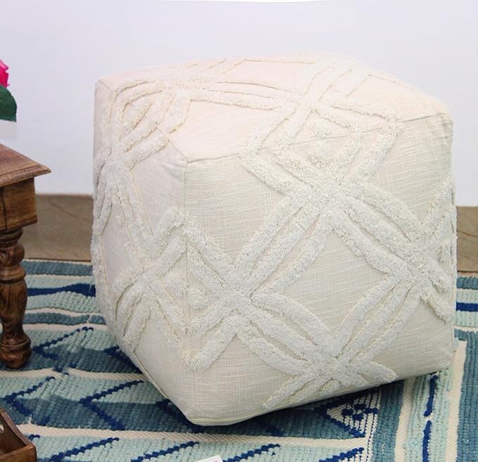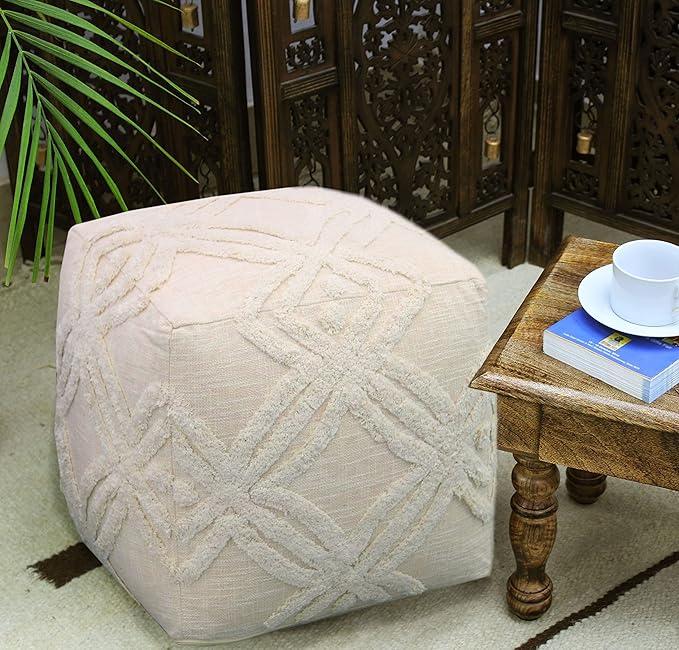 - Transform your Living Space: Expertly made from 100% Cotton by trained artisans. At 16 inches x 16 inches this pouf is perfect for small spaces, the nursery, kids’ room, living room, den and anywhere you need a casual spare seat.