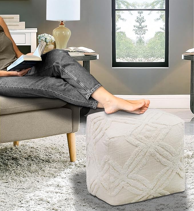 COTTON CRAFT Hand Tufted Pouf - Bedroom Dorm Home Accent - Foot Stool - Ottoman - Bean Bag - Versatile Modern Comfortable Prefilled Woven Cotton Square Pouf Footrest - 16x16x16 inches - Ivory