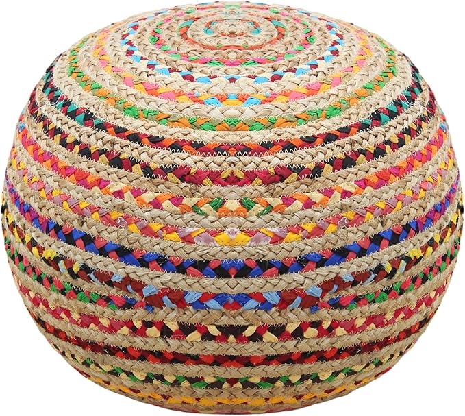 - PRODUCT: Jute Cotton Chindi Braided Round Pouf - Floor Ottoman in Multicolor. Pouf measures 18 inches diameter x 14 inches height and weighs approximately five (5) pounds.