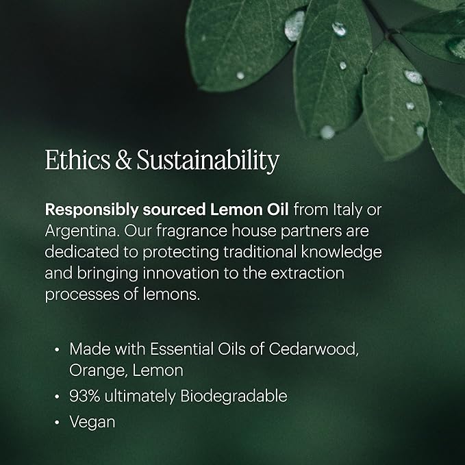 - Premium, Responsibly Sourced Ingredients – Crafted with high-quality essential oils, including ethically sourced lemon oil from Italy or Argentina, plus cedarwood and orange. The result? A luxurious, fresh scent that maintains its purity and vibrancy in an already clean home.