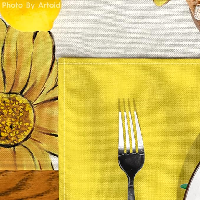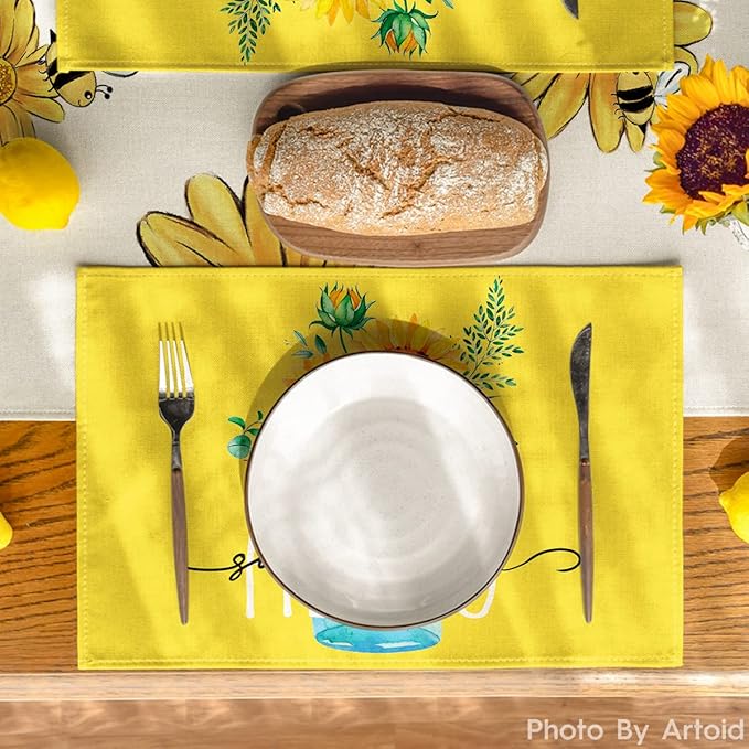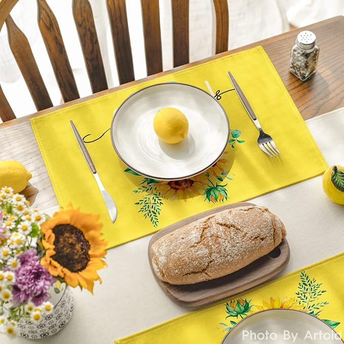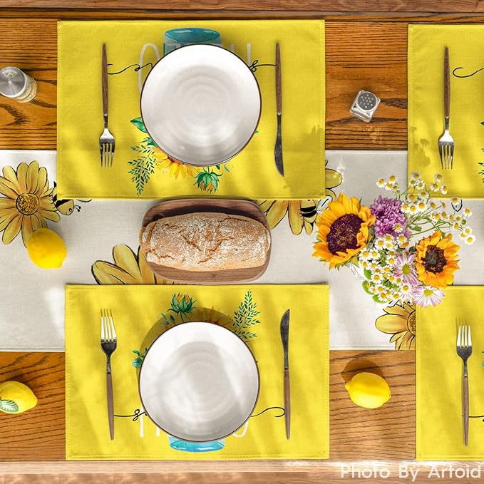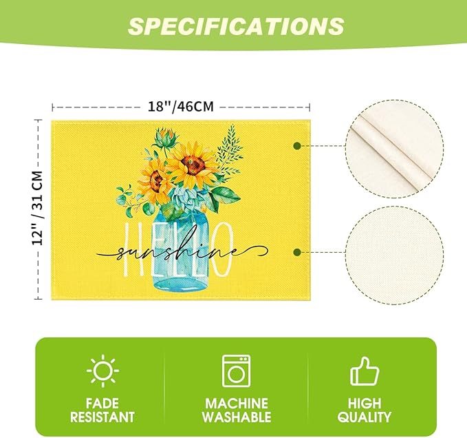Artoid Mode Yellow Hello Sunshine Sunflower Summer Placemats for Dining Table, 12 x 18 Inch Spring Seasonal Holiday Decoration Rustic Vintage Washable Table Mats Set of 4
