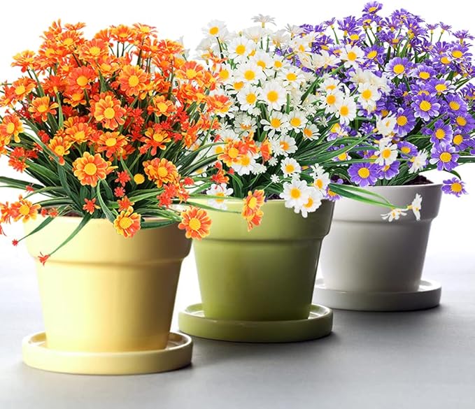 8 Bundles Artificial Daisies Flowers Outdoor UV Resistant Fake Foliage Greenery Faux Plants Shrubs Plastic Bushes for Window Box Hanging Planter Farmhouse Indoor Outside Decor(White)