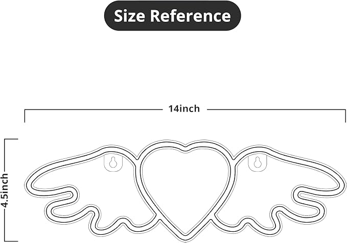 - Easy Installation: Lumoonosity Heart Angel Wings neon sign measures 14 x 4.5-inch. This neon sign has two pre-drilled holes. You can use hooks/thumbtacks to place this neon sign anywhere you like! The simple on/off switch is easy to use, so you don’t have to worry about complicated installations.