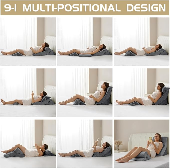 - THE NEWLY DESIGNED 4-PIECE WEDGE SYSTEM: The most advanced & developed wedge pillow set with an ergonomic curve design. Perfect for providing you with an exceptionally comfortable posture when reading, surfing the Internet, during pregnancy, during deep sleep, and during leg discomfort.