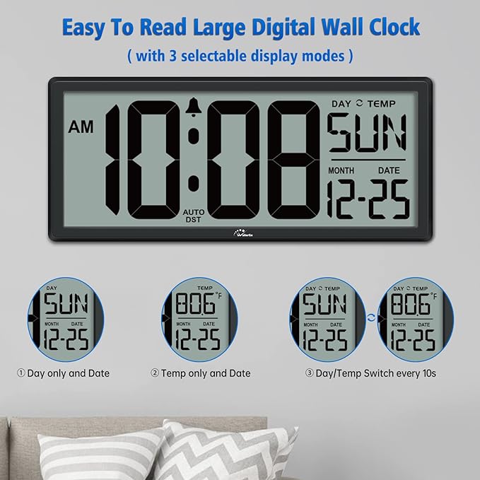 WallarGe 14.5'' Large Digital Wall Clock Battery Operated with Jumbo Numbers, Temperature and Date - Easy to Read and Set, Auto DST