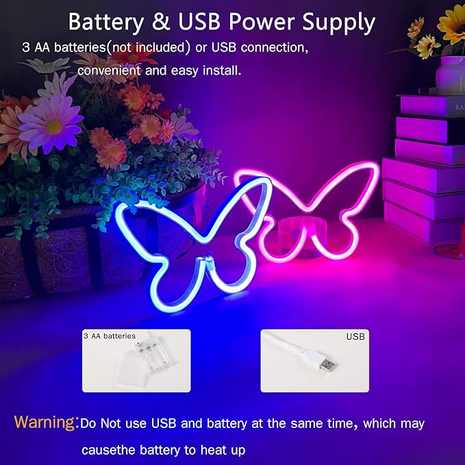 - 【USB & Battery Operated】Size of the butterfly neon light with 2 hooks is 6.7*9.1 in. This neon butterfly room decor requires 3 AA batteries to work or uses a USB adapter to charge, a variety of power supply methods allow you to easily use it indoors and outdoors.