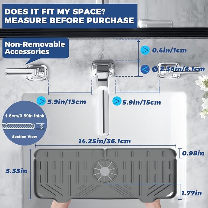 - That there must be no obstructions within a length of at least 5.9 inches on the left and right sides of the faucet. Otherwise there is not enough space to put silicone faucet handle drip catcher tray.