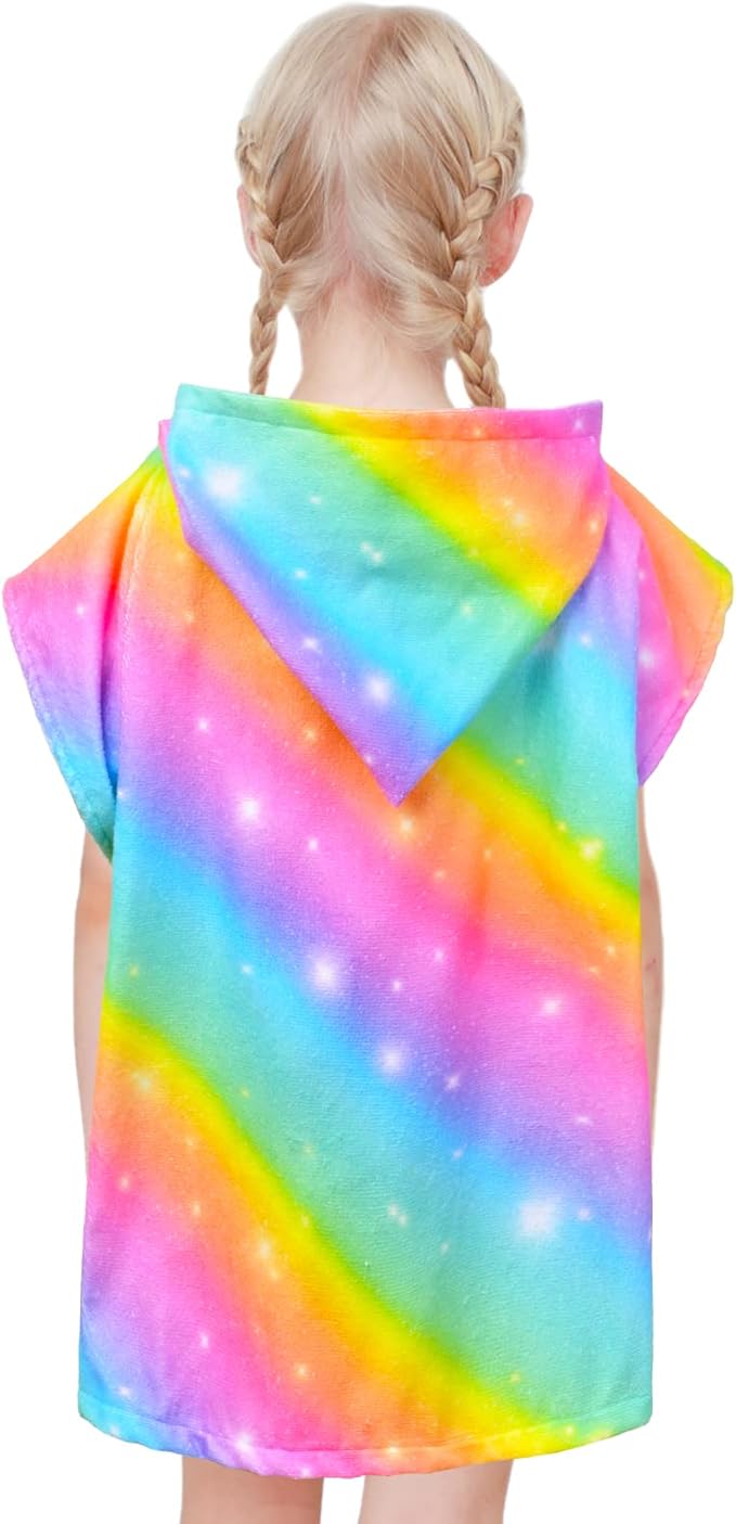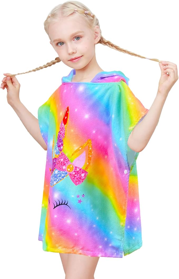 Kids Hooded Towels for Girls, Unicorn Hooded Beach Towel for Kids, Soft & Absorbent Cotton Kids Poncho Towels for 3-8 Years, 24"x24"(Rainbow Unicorn)