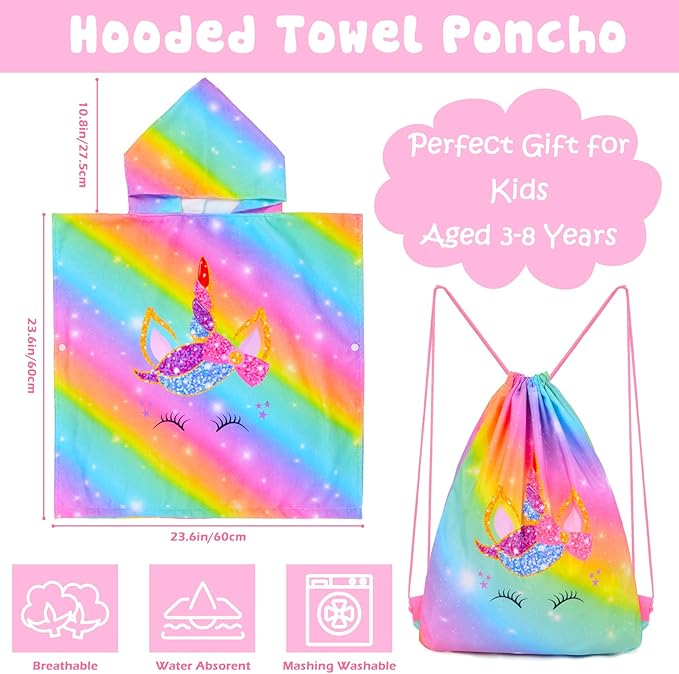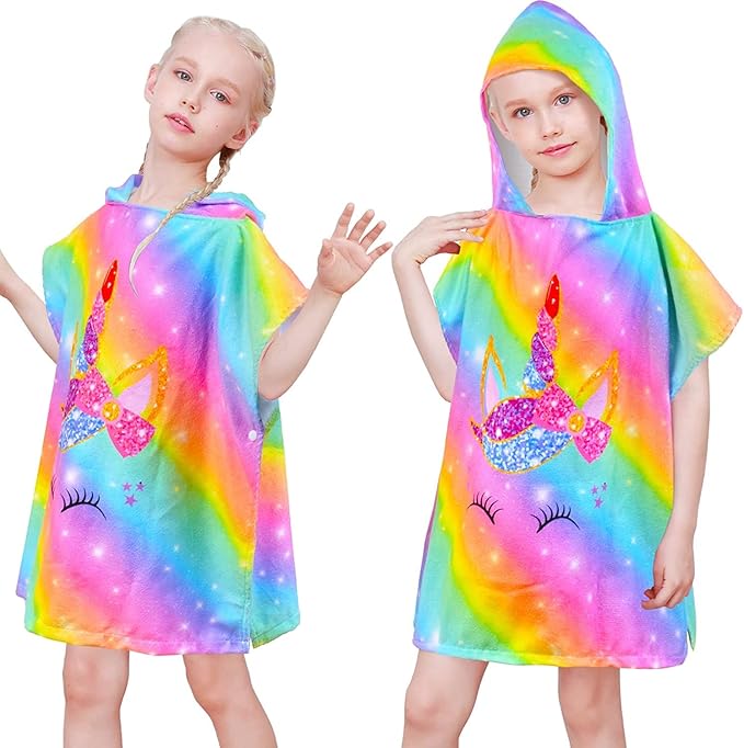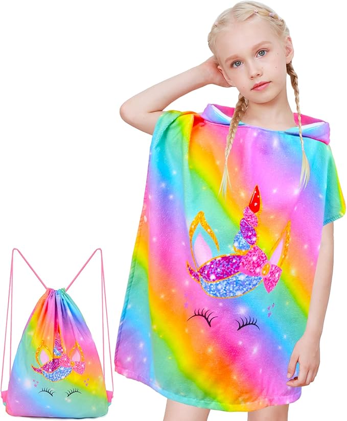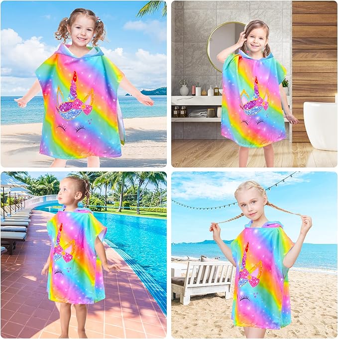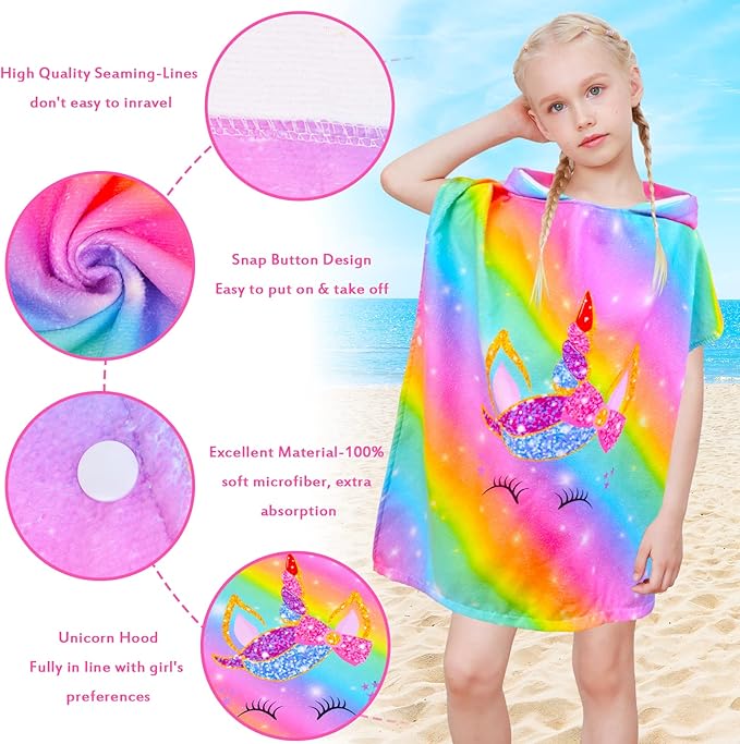 - ??Pure Cotton Material?This unicorn beach towel is made of 100% soft and breathable cotton with ultra-absorbency and durability, friendly to people with sensitive. Our Hooded poncho towels has strong absorbent, keeps your kids warm and dry after shower or swimming.