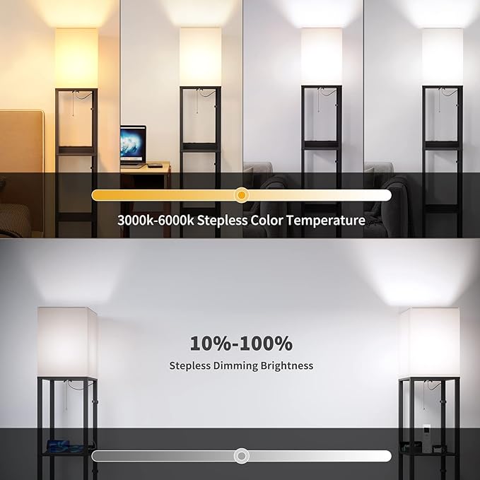 - 【Use in multiple scenarios】You can adjust the brightness and color temperature of the shelf floor lamp according to different scenarios to achieve the most satisfactory effect. For example, when reading a book, you can adjust the light to warm yellow and 50% brightness to achieve the effect of comfortable eye protection. When chatting with your partner before sleeping, you can turn on the night light mode and ready for bedtime.