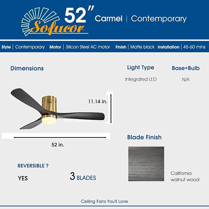 Sofucor Low Profile Ceiling Fan, Flush Mount Ceiling Fan with Lights and Remote Control, 52'' Wood Ceiling Fan with 3 Color Temperature & Adjustable Brightness, Black Wood