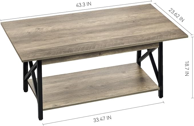 - Large Coffee Table: Farmhouse Rustic coffee table with dimension: 43.3 x 23.6 x 18.7 inches(LxWxH), Height Between Shelves is 11.61 inches. It's perfect for couch diners and lazy evenings when you keep a computer or tablet on the coffee table