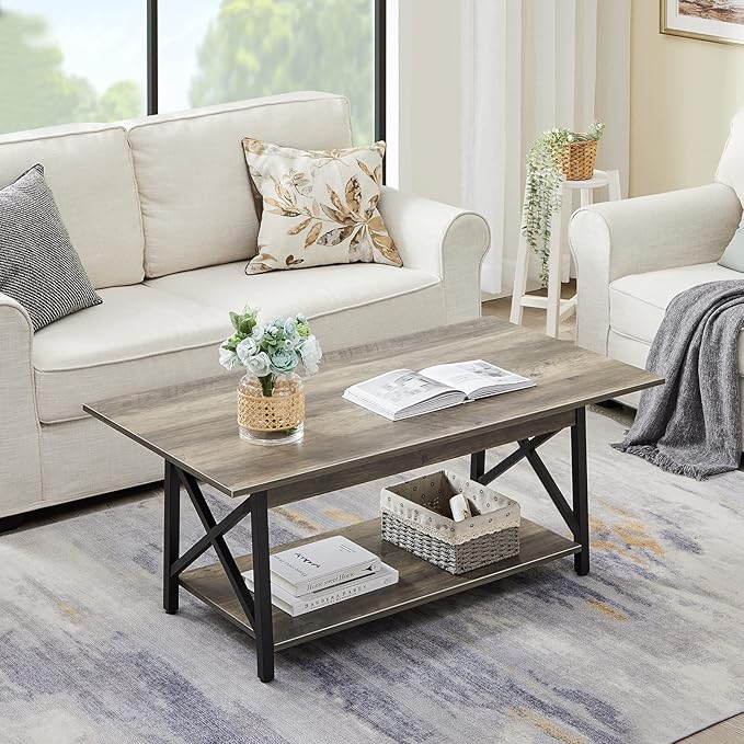 GreenForest Coffee Table with Storage, 43 inch Large Modern Coffee Tables for Living Room, X-Frame Design Farmhouse Coffee Table Space Saving Living Room Tables, Easy Assembly, Grey Wash