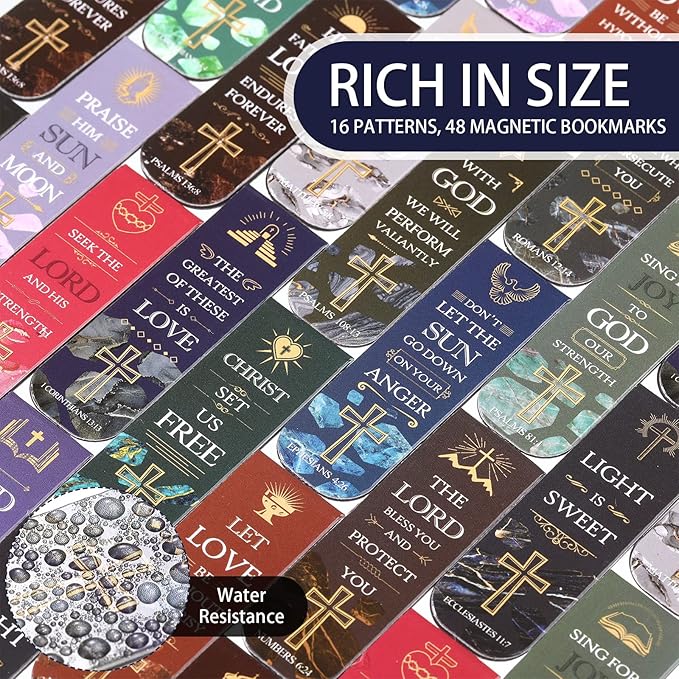 - Enough Quantity: you will get 48 pieces bible magnetic book markers in 16 designs, 3 pieces for each design; Sufficient quantity and styles for meeting your daily life using and replacement, also good to serve as student rewards, birthday gift, holiday gift and so on, express your love easily; Warning: this product contains magnets; Keep away from children and pets