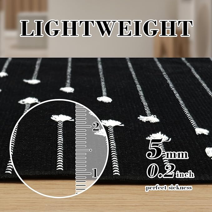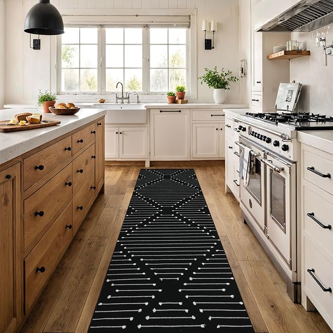 - HAND-WOVEN WITHOUT TASSELS: The black and white kitchen rug runner is using non-printed technology, which makes it last longer and prevents shedding and fading. The extra knot stripes add a lovely and trendy touch