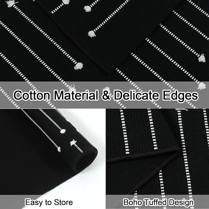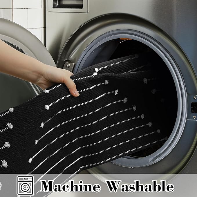 - HAND-WOVEN WITHOUT TASSELS: The black and white kitchen rug runner is using non-printed technology, which makes it last longer and prevents shedding and fading. The extra knot stripes add a lovely and trendy touch