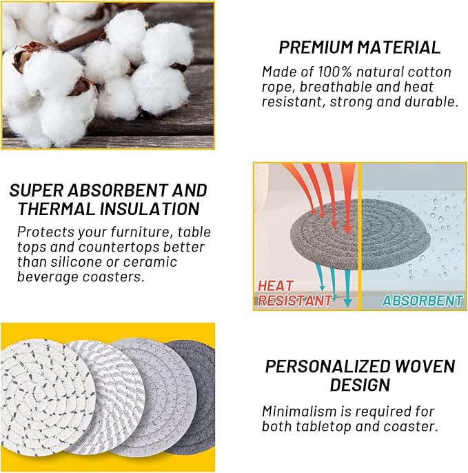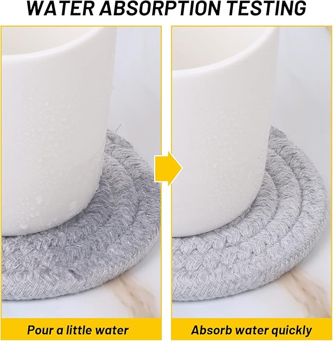 - No More Fear of Spills: Mckanti drink coasters are handcrafted from 100% cotton and linen. They are more absorbent than other silicone or ceramic coasters. This coaster instantly absorbs spilled moisture and then miraculously evaporates , keep it dry and clean at all times. All you need to do is place your drink on the Mckanti drink coaster and enjoy your drink time.