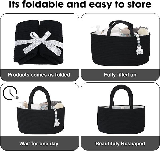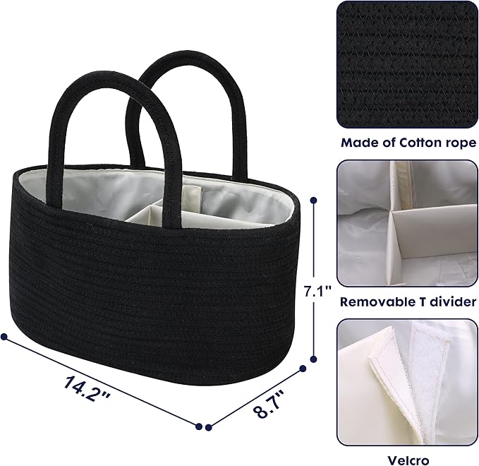 Baby Diaper Caddy Organizer for Girl Boy Cotton Rope Nursery Storage Bin Basket Portable Holder Tote Bag for Changing Table Car Travel Baby Shower Gifts Newborn Essentials Registry Must Haves Black