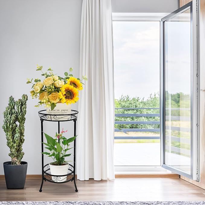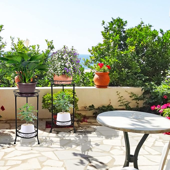 - 【Rustproof & Weather Resistance】Upgraded quality Metal frame, the well painted black powder coated finish provides strong weather resistant for this flower stands for indoor plants. It can fit indoor or outdoor use, meet your gardening needs in balcony, living room or patio areas.